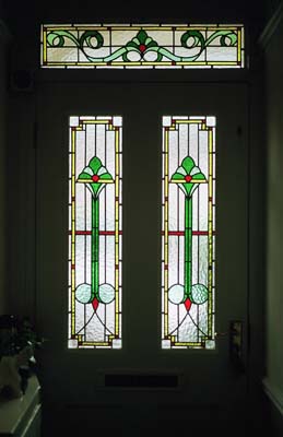 This commission called for good classical proportions, with colour used to delineate the design. The use of an inset border, not only frames the design, it appears to suspend it in space, helping to produce an added sense of lightness. The use of obscured clear glass allows natural light to continue to fall in the hallway whilst preserving privacy within.