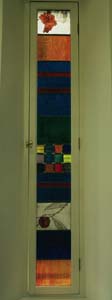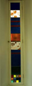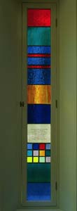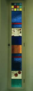 These four windows run the length of a gallery extension to a large Victorian house. The theme chosen for the design was Marvell's poem 'The Garden'. The semi-abstract setting is in keeping with the light and contemporary feel of the space and continues the influence of Mondrian used in the stained glass in the hall. As well as the fruits described in the poem the images