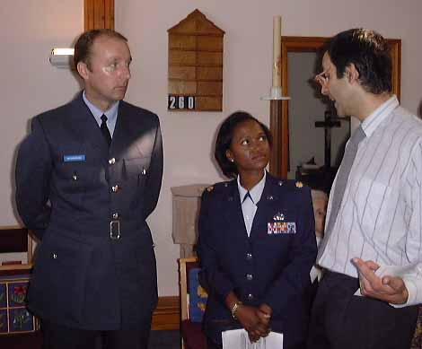 The Artist (right) discussing the commemorative window with representatives of the RAF (left) and the USAF (center)