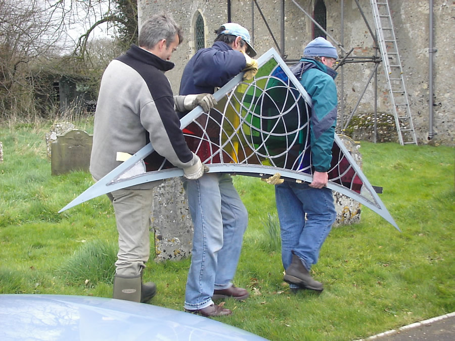 The installation of the stained glass window was achieved by first securing it to a steel frame specified by the architect Nigel Sunter of Purcell, Miller, Triton appointed for overseeing the entire church restoration. The frame was itself then attached to another window frame in the nave with screws. |