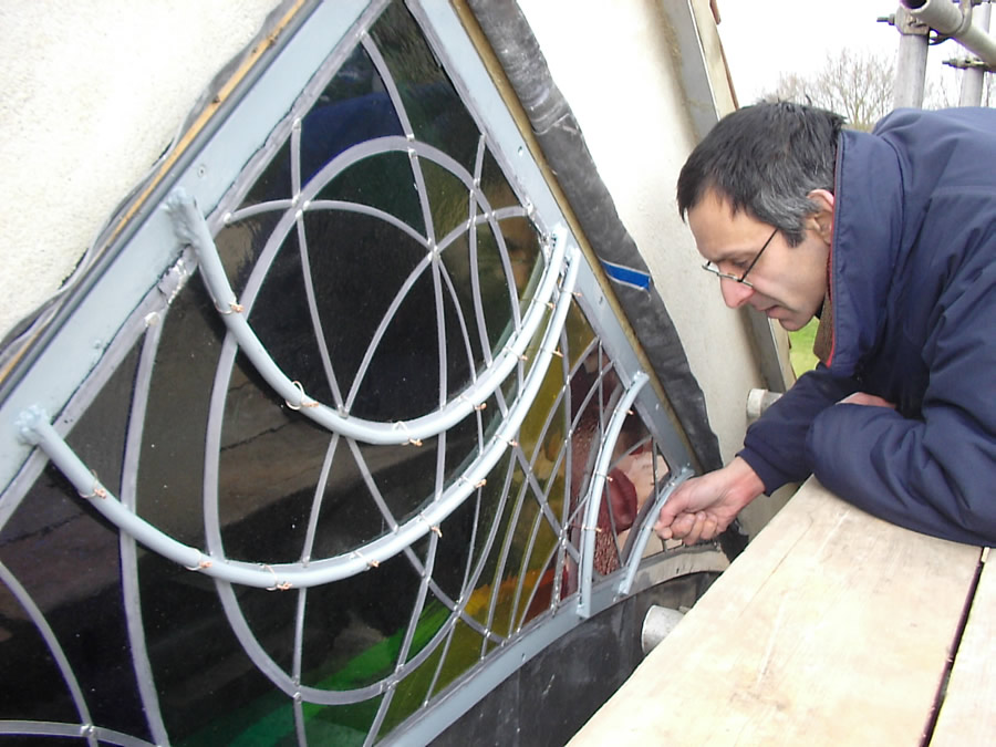 The artist making a final inspection of the glass and fitting before the lead flashing cover is pushed into place.