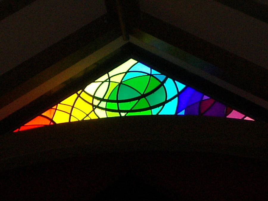 The artist chose for the starting point of his design the centuries old motif of the Rose Window. This was then made to expand outward as it were to create a freer modern layout with a sense of its own outward movement. This more abstract treatment of a traditional design whilst paying regard to ecclesiastical practice, permit's the present congregation of the church to imaginatively associate the work with personal values of their own. Visually the stained glass symbolises the cycle of human life, whether one wishes to conceive of the passage of time as a recurring cycle as in nature or as being progressive as in the accumulation of human history. The design can be appreciated from a number of points and angles. It can be enjoyed as one likes from either side to side or top to bottom. This allows the eye the freedom to move at will and in so doing counteract any sense of constriction felt on account of the window's relatively small scale. |